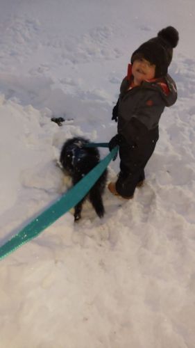 The provided image does not contain a bug or insect; it shows a child walking a dog in the snow.