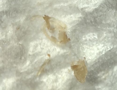 The image provided does not display a distinct insect or bug. The objects appear to be fragments of debris, dried skin, scab material, boogers (dried nasal mucus), or earwax on a tissue. They lack the symmetrical features, legs, antennae, or segmentation required to identify an arthropod.