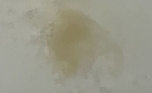 The image provided is too blurry and lacks sufficient detail to make a positive identification. The subject appears to be a small, pale smear or smudge, which could be a crushed insect larvae, a smudge of organic matter, or a very out-of-focus insect, but no diagnostic features (legs, antennae, segmentation) are visible.