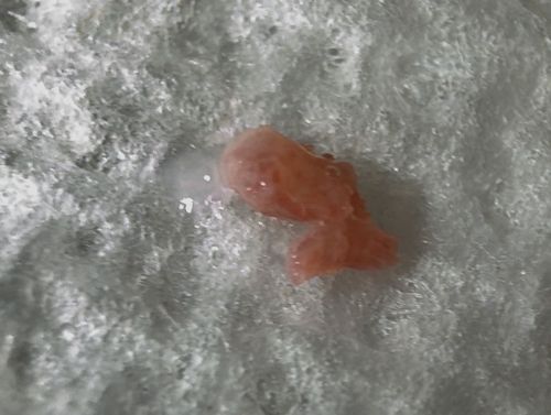 The image appears to show biological matter, possibly phlegm, mucus, tissue, or regurgitated food, resting on a fibrous surface like a tissue or paper towel.