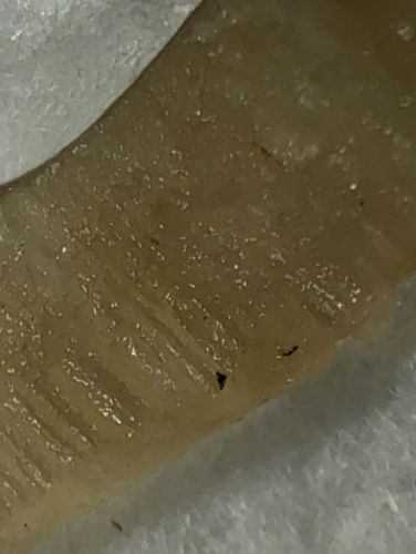 The provided image does not contain a discernible insect or bug. The image appears to show a close-up texture of a semi-translucent, brown or amber-colored material (possibly tape, amber, or a dried substance) with small, dark specks that do not clearly resemble insect anatomy.