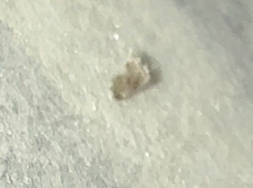 This object is non-living. It does not move, eat, or reproduce. Its appearance is likely a result of shedding skin, accumulated dust/lint, or a small scab.