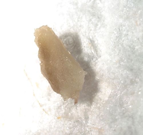 Inanimate. This appears to be a small, translucent, brownish-yellow fragment. It lacks legs, antennae, segmentation, a head, or distinct insect body parts. The texture appears waxy or crusty.