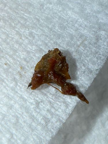 Size: Undetermined; appears to be very small, likely under 1 cm based on the texture of the paper towel.