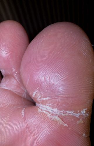The image shows the characteristic 'burrow' or tunnel lines on the skin (specifically the sole of the foot). Female mites tunnel into the stratum corneum to deposit eggs and feces, causing intense itching and an allergic reaction.