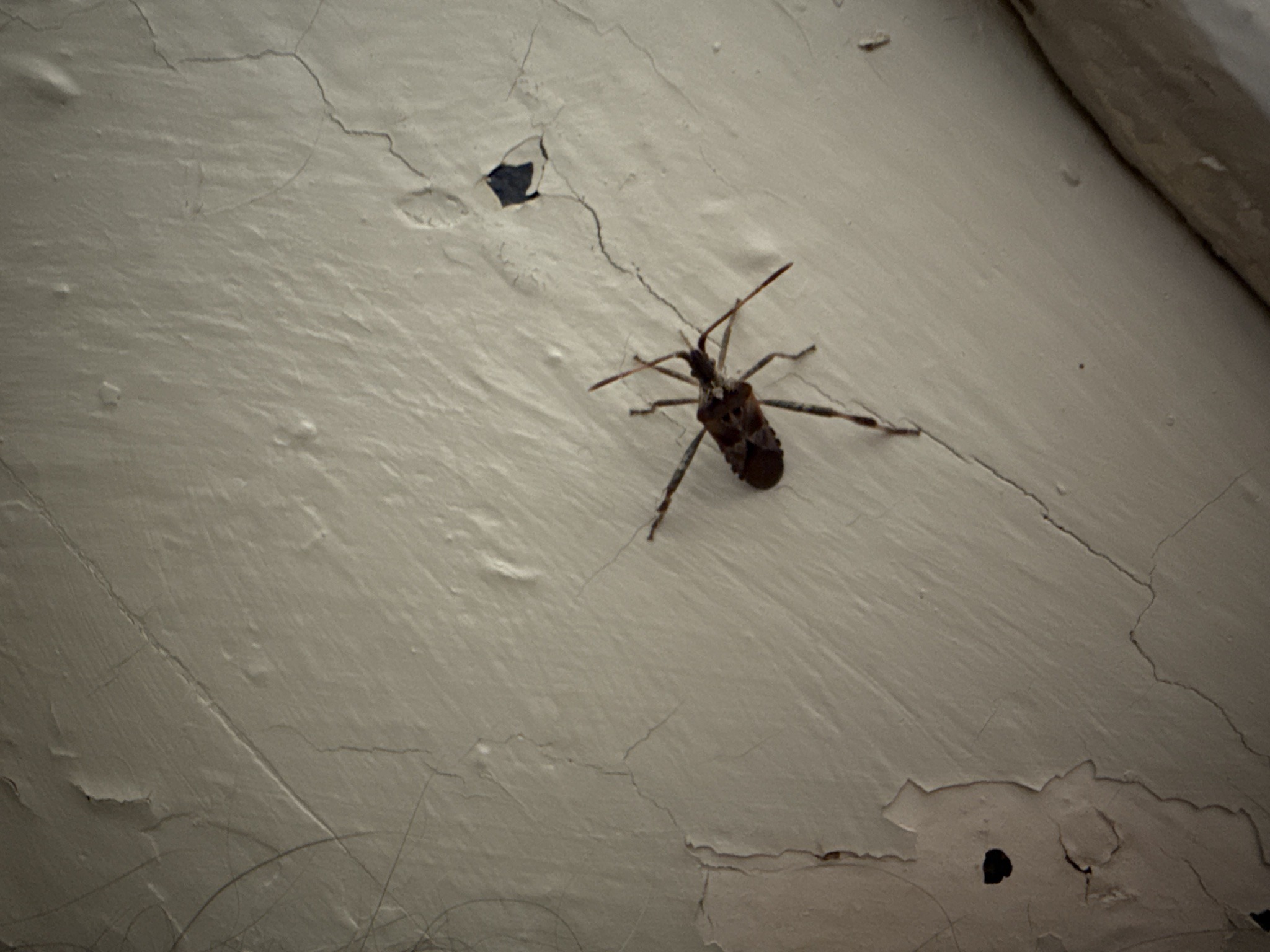 They are leaf-footed bugs known for the flattened, leaf-like expansions on their hind legs. They are strong fliers and produce a buzzing sound when in motion. They often congregate on sunny walls in autumn before seeking indoor overwintering sites.