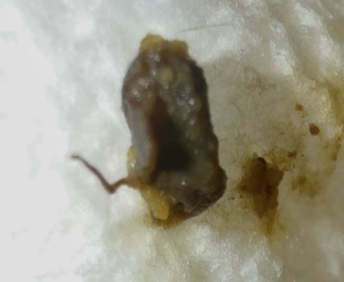 Questing (waiting on grass tips for a host to brush by) or actively hunting (soft ticks). When not feeding, they hide in crevices or ground litter. The specimen in the image appears to be partially engorged and possibly dead or desiccated.