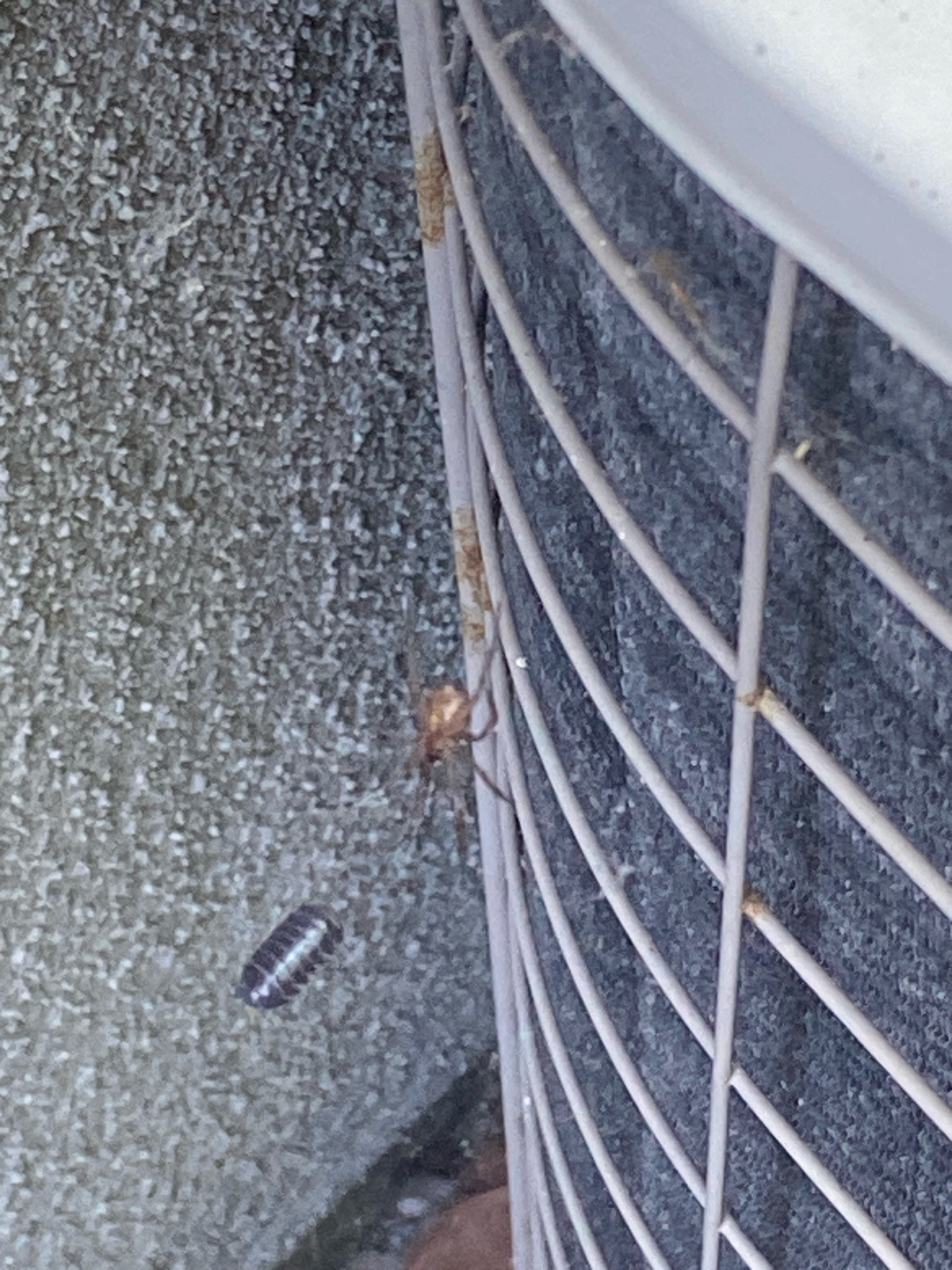 Damp, dark places under logs, rocks, or leaf litter, often near buildings or gardens where woodlice are present.