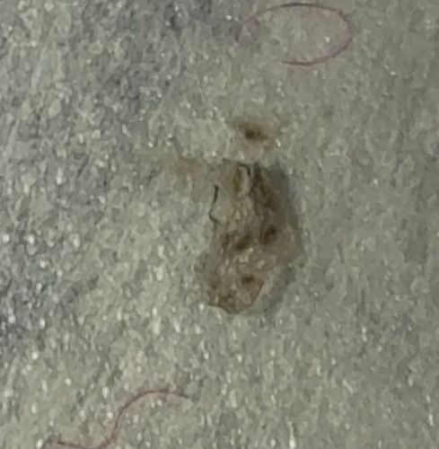 Typically found on the human scalp, attached near the base of hair shafts. However, the debris pictured is dislodged and on a fabric surface.