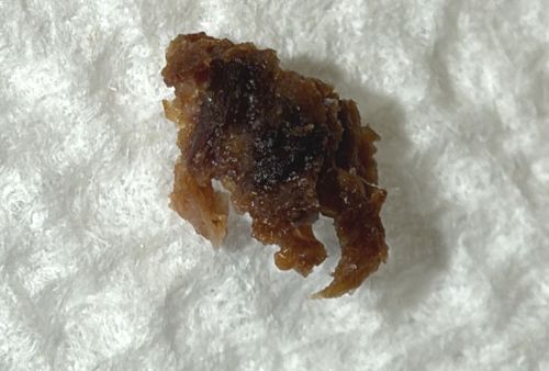 The object in the image does not display distinct morphological features of an insect (such as legs, antennae, wings, or segmented body parts). It strongly resembles non-insect debris such as dried earwax, a scab, desiccated booger, or a crushed food particle.