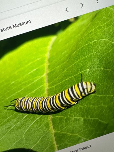 The larva undergoes five growth stages called instars. It feeds voraciously to store energy for metamorphosis. The bright yellow, white, and black stripes serve as aposematic coloration, warning predators of its toxicity.