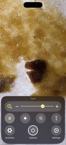 The image displays a dark, irregular fragment without clear anatomical features such as legs, wings, or distinct segments, suggesting it may be a piece of food residue (like a seed or crumb) or a fragment of an insect rather than a living specimen.