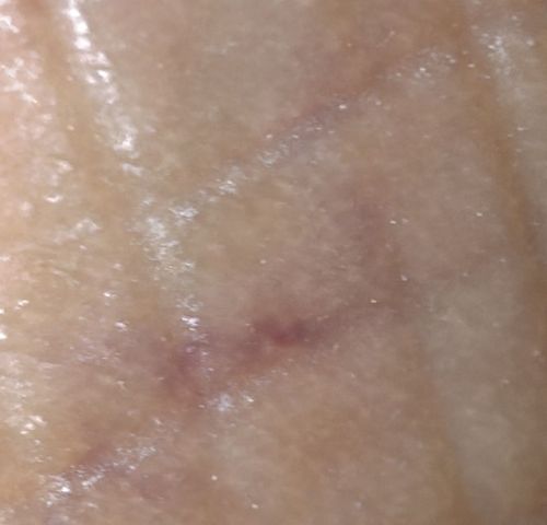 Female mites burrow into the upper layer of the skin to create tunnels where they live and lay eggs. The burrow appears as a fine, wavy, and slightly raised greyish or skin-colored line (as seen in the image). The life cycle from egg to adult takes about 10-14 days.
