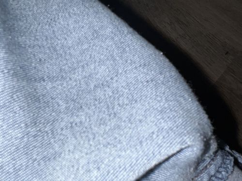 The provided image shows a close-up of a blue or grey fabric material, possibly denim or cotton, but there is no identifiable insect visible. Some light-colored spots appear to be lint or pilling of the fabric fibers.