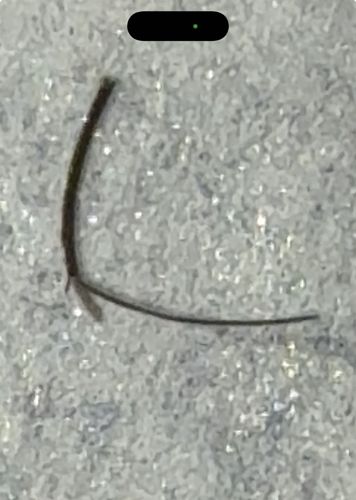 Static; does not move. This object appears to be a piece of lint, a synthetic fiber, a hair, or a small twig/detritus rather than a living organism. Its sharp angle suggests a break or bend in non-living material rather than typical insect segmentation.