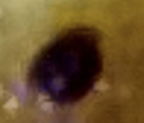 The image context is unclear, appearing to be on a biological surface (possibly skin, food, or a plant) or a zoomed-in blurry photo of a dark spot.