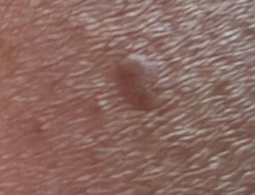 Size: Estimated 2-5 millimeters based on surrounding skin texture