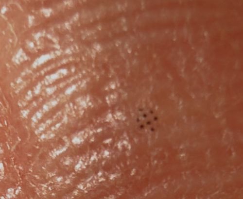 This image depicts a pattern of tiny dots on skin rather than a living organism. While often mistaken for mite bites or insect eggs due to health anxiety, this specific hexagonal or clustered dot pattern is most commonly caused by incidental contact with the tip of a felt-tip pen, marker, or printed text that transfers a specific dot-matrix pattern.