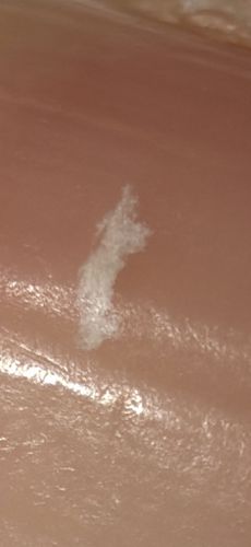 No risks. This appears to be a harmless piece of debris, possibly a skin flake or lint, rather than a biological organism.