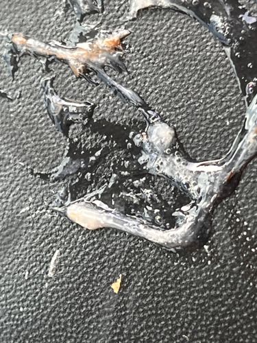 The image does not show a biological organism. The visual characteristics (translucency, lack of symmetry, presence of air bubbles, and glossy surface) are consistent with a dried or semi-dried liquid residue, such as adhesive, resin, or biological secretion like snail/slug mucus.