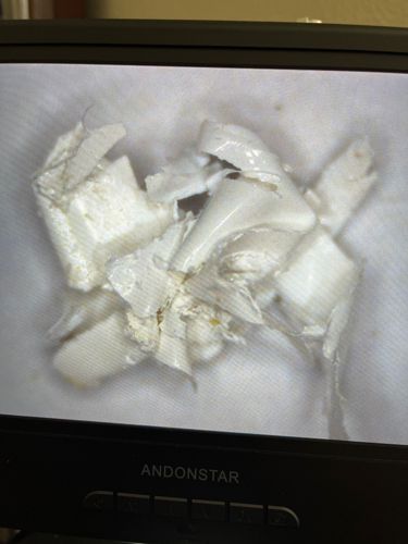 The image shows shredded, white, 3D-structured material through a digital microscope. The uniform parallel lines and geometric fragments are characteristic of synthetic fabric fibers or processed paper products under magnification.