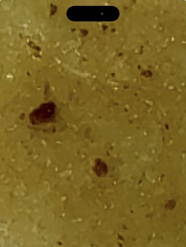 The image provided is too blurry and low-resolution to make a positive identification of any insect or pest. The visible spots could be debris, scabs, dirt, or insect parts, but no distinct morphological features (legs, antennae, body segments) are visible to confirm a species.