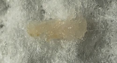 Adult tapeworms live in the intestine. They shed segments (proglottids) containing eggs. These segments are mobile when fresh and can be seen expanding and contracting. As they dry out (like the one in the image might be starting to), they look like grains of rice or sesame seeds.