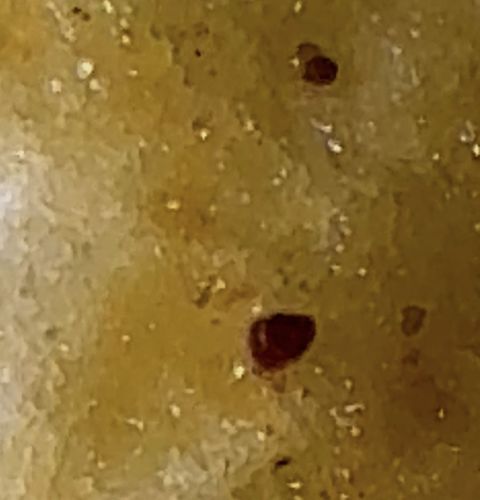 The provided image is too blurry and lacks sufficient detail to identify a specific insect or bug. The dark spots could be anything from soil particles, small scabs, mites (like clover mites or spider mites), or simply imperfections on a surface. Without clearer visual features such as legs, body shape, or antennae, a positive identification is impossible.