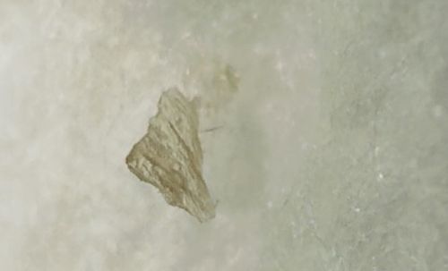 Size: Microscopic; adult females are 0.30–0.45 mm long and 0.25–0.35 mm wide; males are slightly smaller. The object in typical photos visible to the naked eye is often a clump of skin, mite debris, or a burrow entrance.