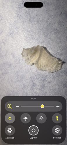 This object is inanimate. It is a piece of shed skin or a similar organic flake, not a living insect.