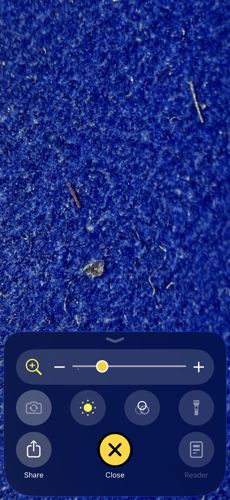 The image shows what appears to be a small piece of debris, lint, or particulate matter on a blue fabric surface, rather than an identifiable insect.