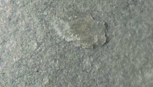 Stationary. Does not exhibit biological movements or lifecycles. It appears to be an inanimate object, potentially a dried skin flake, a scab, a piece of food residue, or crystallized material.