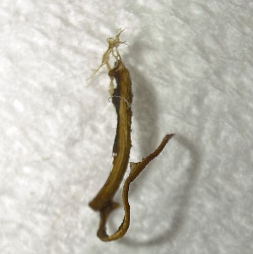 The object shown appears to be a dried piece of organic plant matter, such as a root fragment or stem, rather than an insect. It lacks the segments, appendages, or symmetry characteristic of arthropods.