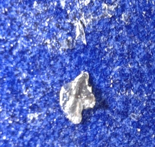 This object is inanimate. It appears to be a flake of dried skin, a piece of glitter, a mica flake, or a piece of plastic debris resting on a blue textured surface.