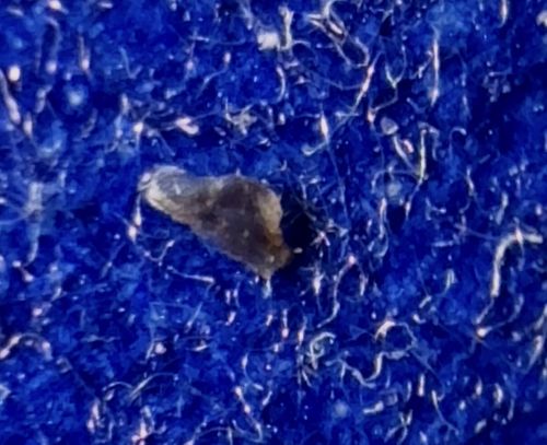 This object is inanimate. It does not move or exhibit behavior. It is likely a piece of dried skin, a small scab, or earwax that has fallen onto a blue fibrous surface (likely fabric or carpet).