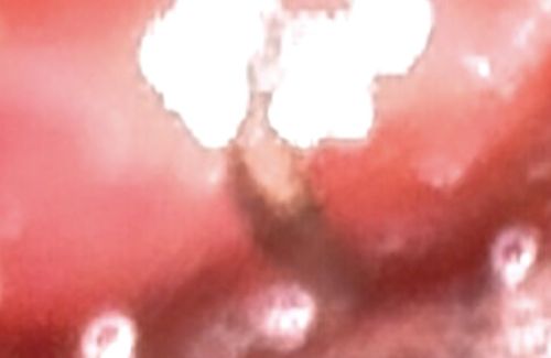The provided image is too blurry, zoomed-in, and abstract to identify any specific insect or biological organism. It appears to be a macro shot of a reddish surface with white reflections or spots, but lacks distinguishing features required for classification.