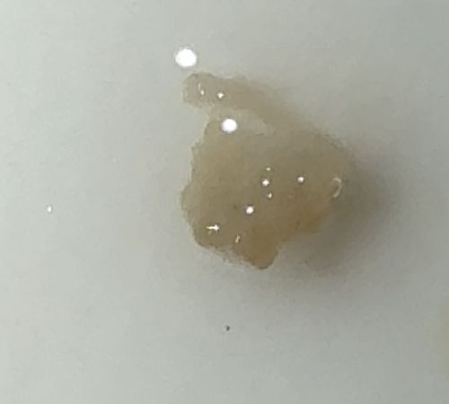 The image provided does not display recognizable anatomical features of an insect or arachnid. It appears to be an amorphous, translucent blob, possibly resembling ear wax, sebum, a dried droplet of liquid, or a small fragment of food. Without distinct features like legs, antennae, segmentation, or a head, a positive biological identification is impossible.