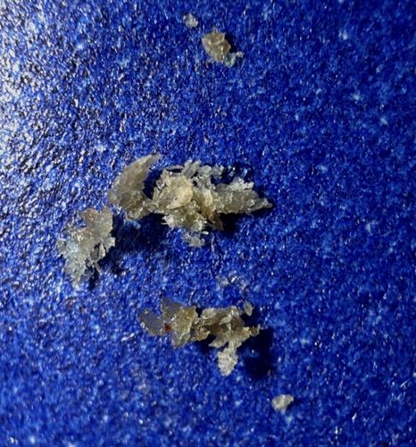 The material in the image lacks anatomical structures such as legs, antennae, or segments characteristic of insects. It appears to be amorphous flakes of biological or synthetic debris, often mistaken for parasites or pest larvae.