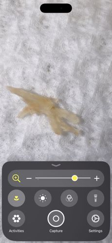 The object in the image appears to be a piece of translucent debris, such as a dried adhesive, a plastic scrap, or a fragment of organic matter like a seed pod or root flake. It does not possess the bilateral symmetry, segmented body parts, or defined appendages of an insect.