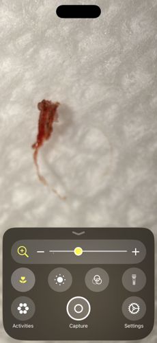 The object lacks distinct biological features such as legs, antennae, or a segmented body. It appears to be an irregular clump of reddish-brown material or a lint fiber.