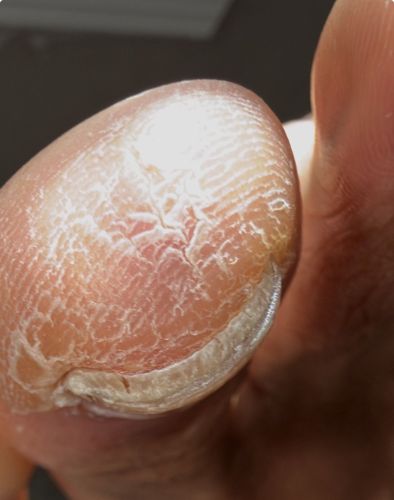 The image provided does not contain a bug or insect. It shows a human toe with dry, peeling skin, potentially indicating a callus, dry skin, or a fungal infection like Athlete's Foot (Tinea pedis), but no arthropod is present.